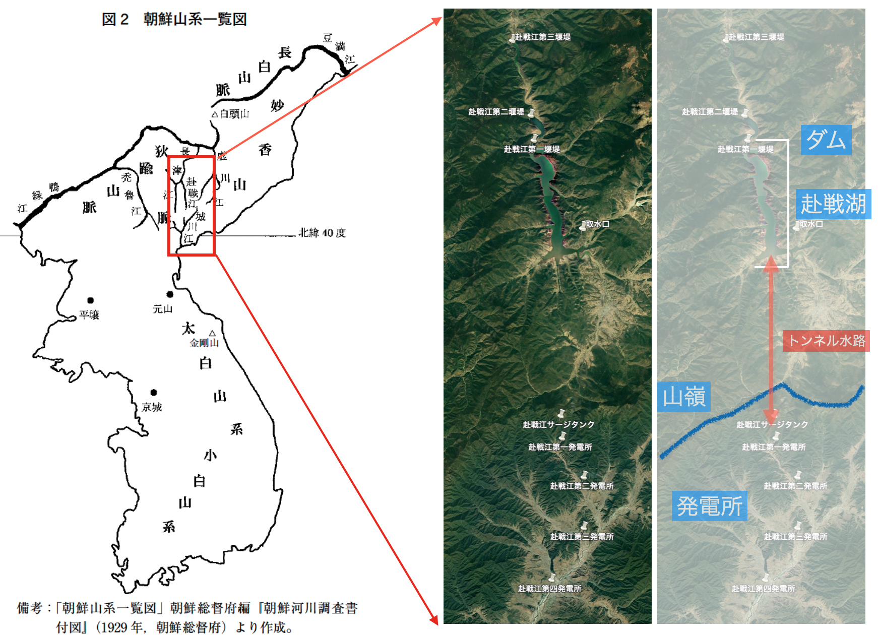 2025年現在この送水管と発電所が残っているのは驚きだ。Google Earthでその存在が確認できるのだ。動画の最初に山頂直下に忽然と現れるのは、サージタンクといって、20kmにおよぶ地下トンネルの出口である。ここで水流は外気に一旦触れる(圧力調整用の空気穴)のである。このタンクの底から送水管が垂直に近い壁を下る。この送水管はポーランドから輸入されたもので、当時の日本にこの圧に耐えられる送水管はなかった。約700mの落差でを経て、動画の最後は第一発電所である。一つ前の写真に写っている建物を上空からみたものである。朝鮮民主主義人民共和国は今でもこの発電システムを使っているのであろうか?