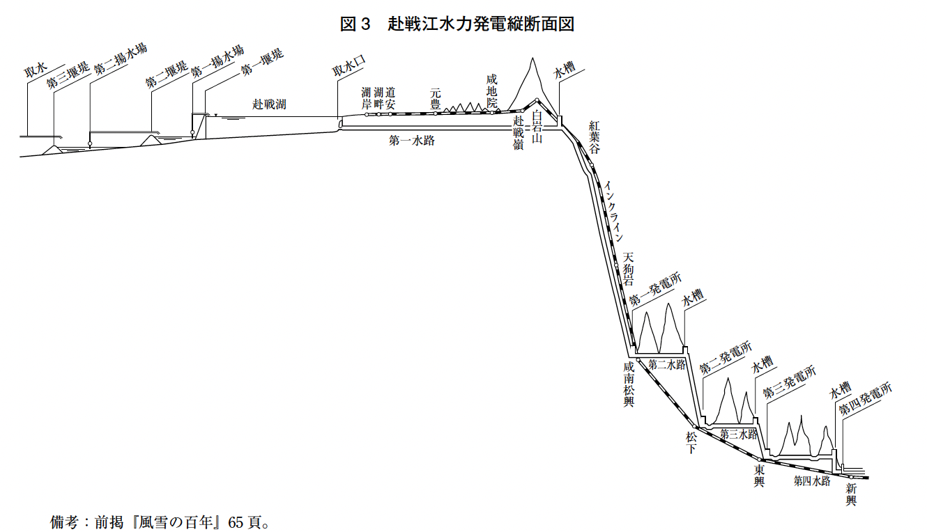 図で見る川は右から左に流れているが、これをダムでせき止める。その最上流部の山嶺の地下に水を流すトンネルを掘ったのである。(右にむかって、すなわち日本海側に・・)険しい山嶺をくぐり抜けると、その先には断崖絶壁が待っているのだ。ここまで誘導してやれば、水は一挙に700mの高低差を下ることになる。20km進んでも100mしか下らない高原と、数キロの間に700m下る断崖。その運動エネルギーの差は凄まじいものがある。彼らが設計した赴戦江第一発電所は、当時としては桁外れの巨大発電所であり、その発電力は14万KWであった。これは同時期(大正14年)に完成した五ヶ瀬発電所(1.35KW)の10倍という桁違いの規模なのである。激流を利用した発電所はほぼ同時期にあと3箇所作られ、その合計発電力は20万KWとなる。