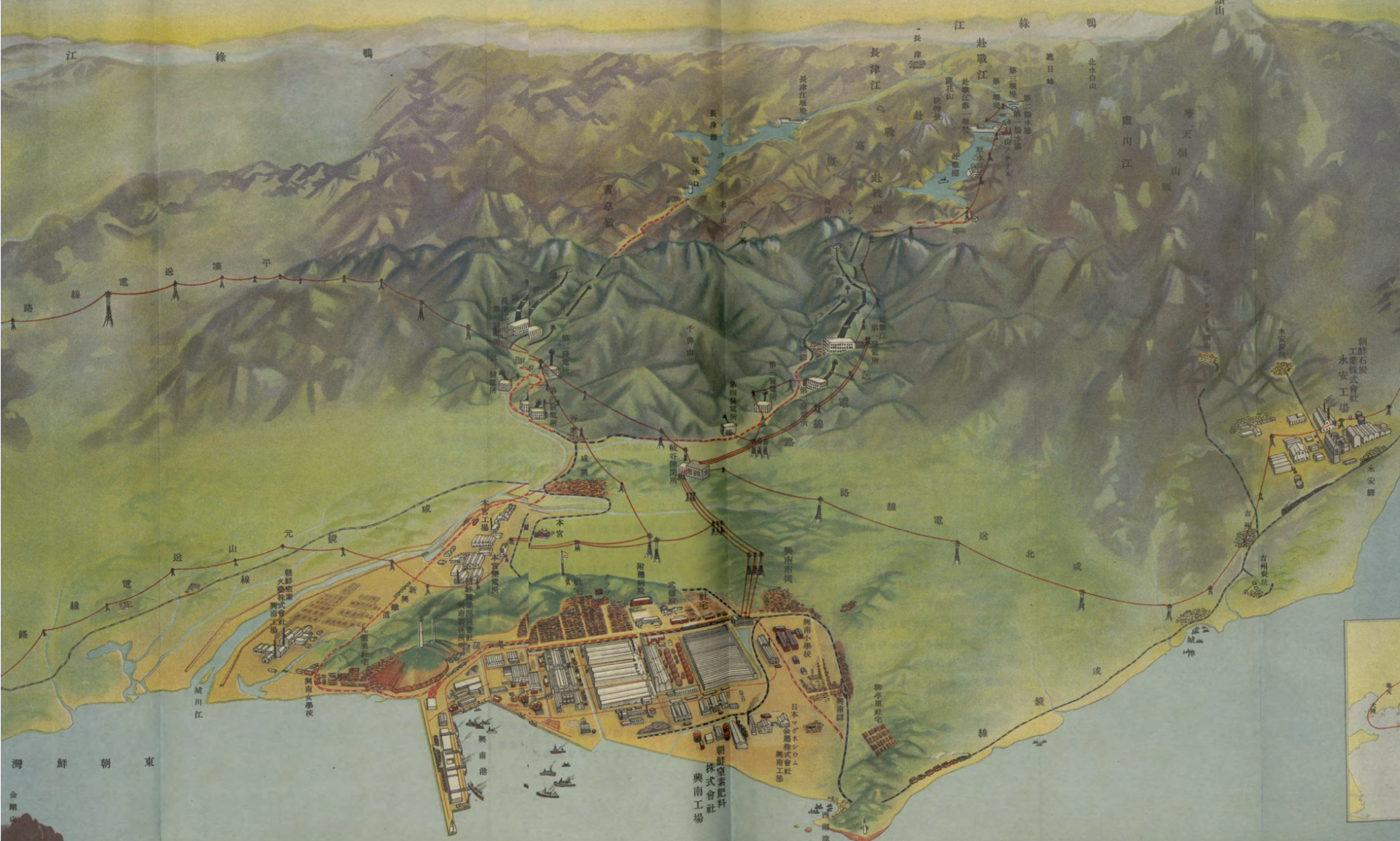 さて、上の鳥瞰図は日本海側、興南コンビナート上空から2つのダム・発電所群を見下ろしている図譜である。興南コンビナートでは発電所が完成する前から肥料工場の建設が進められ、肥料生産に間に合わせるため、水路・発電所建設には大変なプレッシャーがかけられたそうである。この工事を主導したのは森田であり久保田であったが彼らの伝記には、非常に詳しく当時の建設現場のことが記載されている。