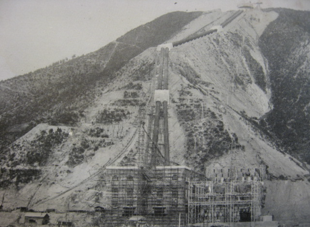 上の写真は山頂から続く2本の巨大な送水管と第一発電所である。送水管の左に「線路」のようなものが崖を登るのが見えるが、これがインクラインである。このインクラインですべての資材・機材・人材を持ち上げたのである。