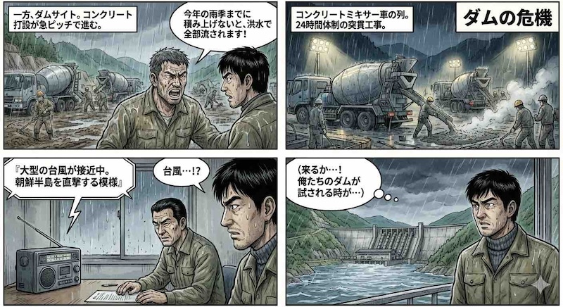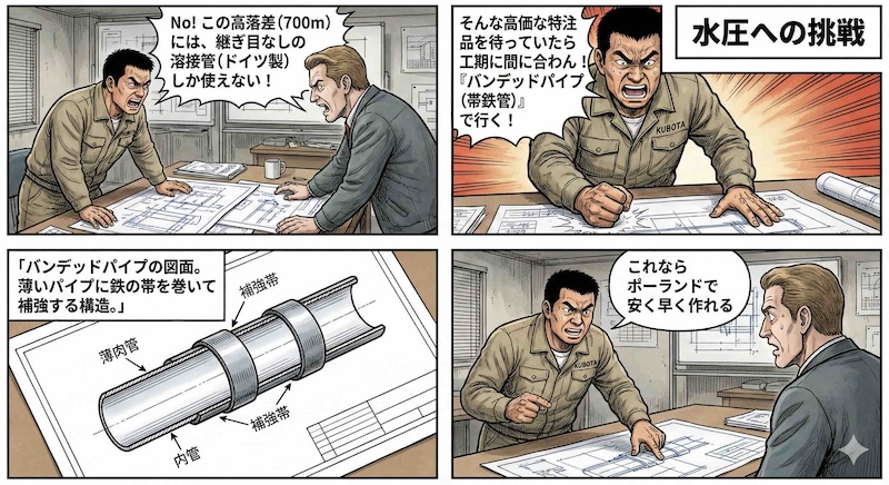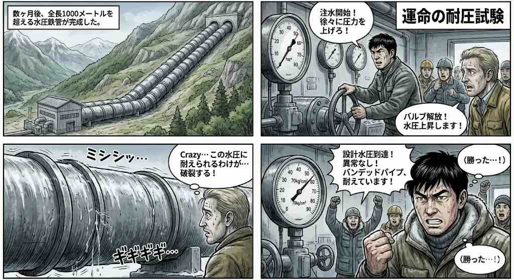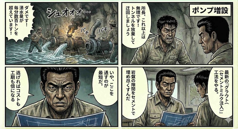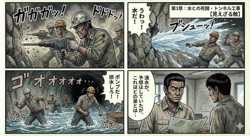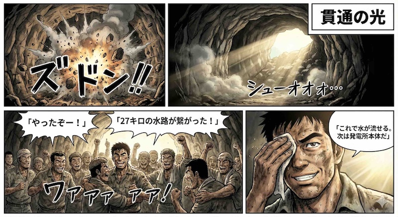 赴戦高原は1000m以上の高原であり、ここに資材をあげるためにはケーブルカー(インクライン)しかなかった。インクラインが命綱だったわけです。このプロジェクトには大きく(1)20km以上におよぶトンネル水路の掘削、(2)ダム建設、(3)トンネルに引き続く山頂からの水路管建設、(4)発電所建設が必要であり、いずれも前人未到の事業でした。