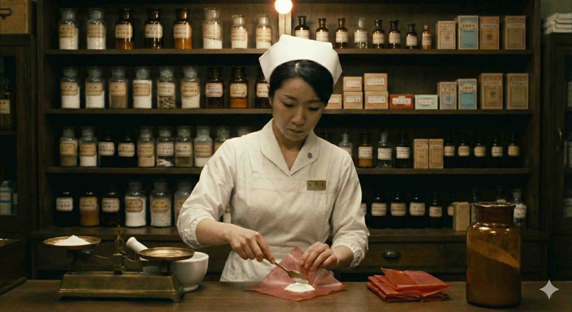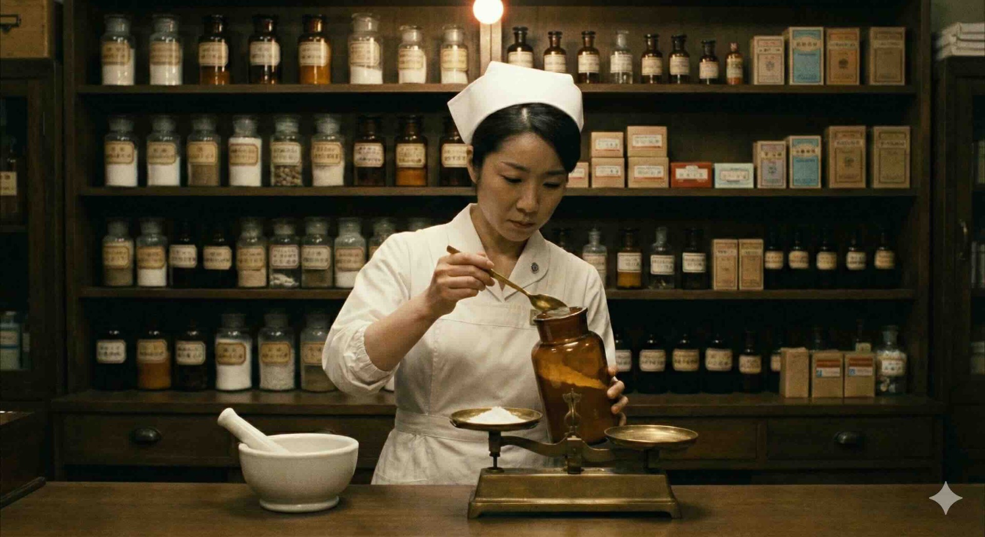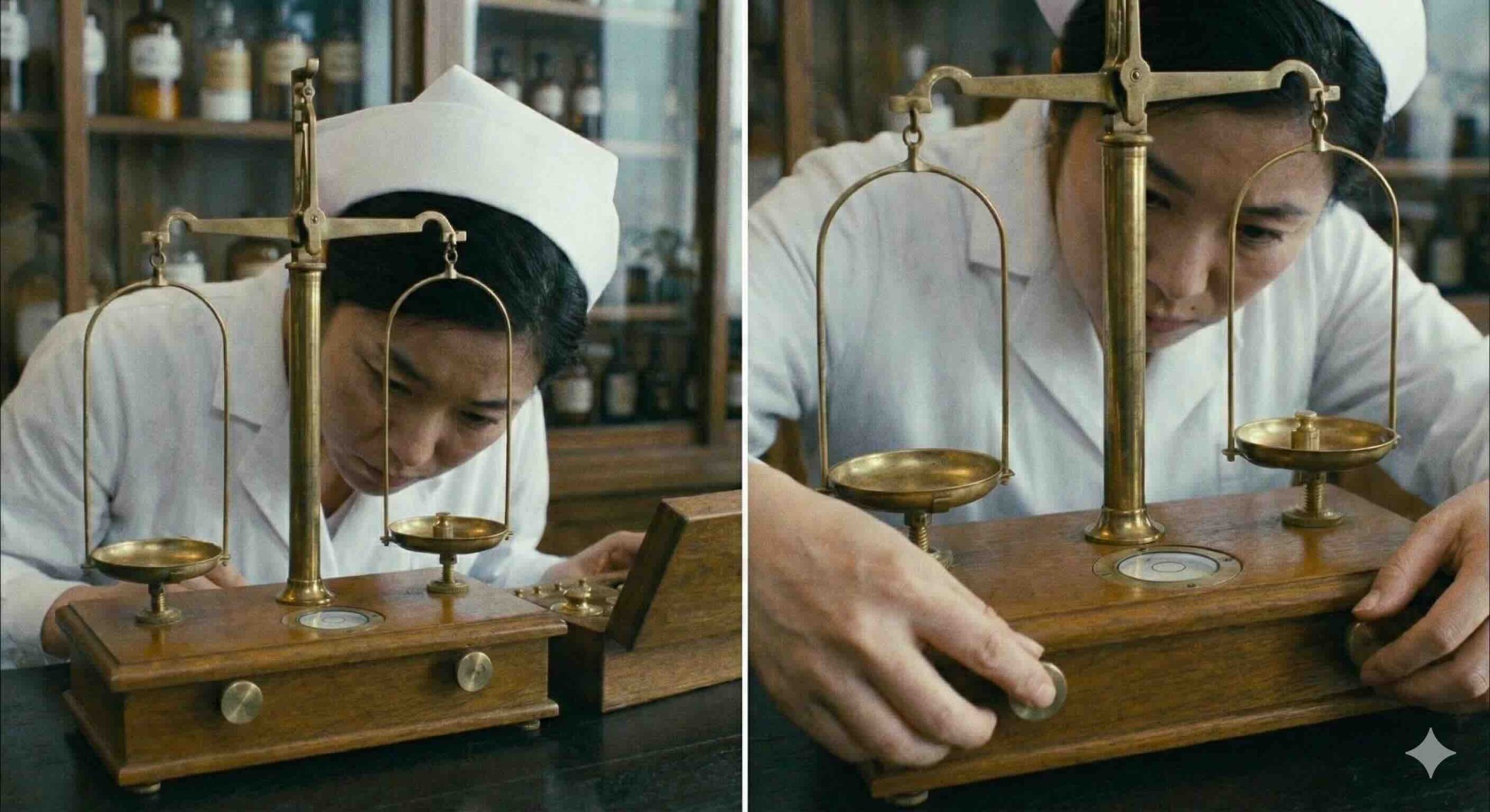 昔は苦い粉薬しかなかった。天秤で正確に取り分けている看護師。左の乳鉢にいれるのかな。怪しげな薬の瓶が・・・