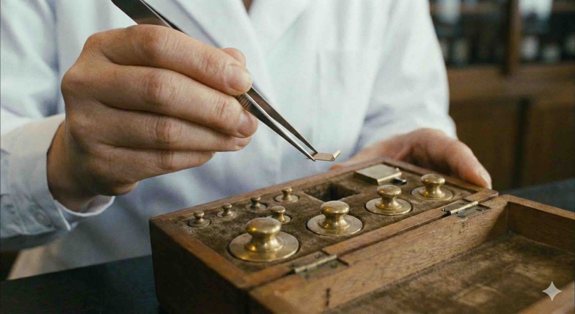 分銅の確認です。看護師が持っている金属片は0.5gの少量のおもり。こんな木箱を妄想老人も覚えています。