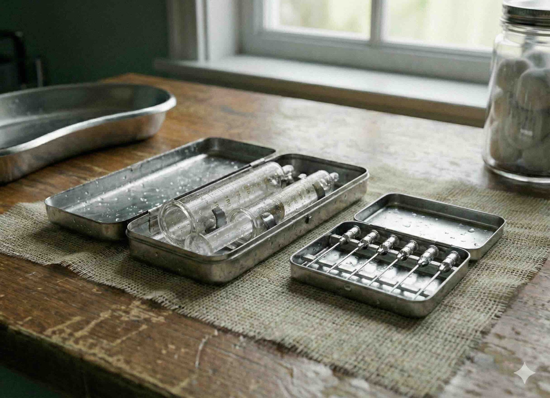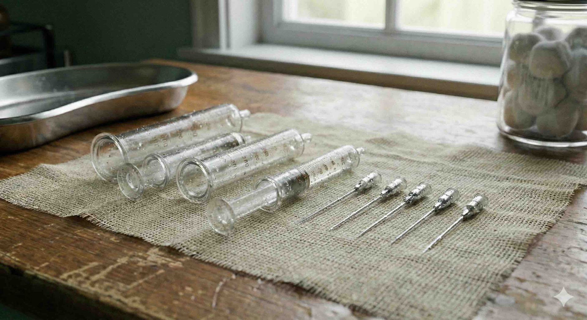 使用後のガラスの注射器は洗って乾かす。針も貴重だったんでしょう、使いまわしていたとのこと。