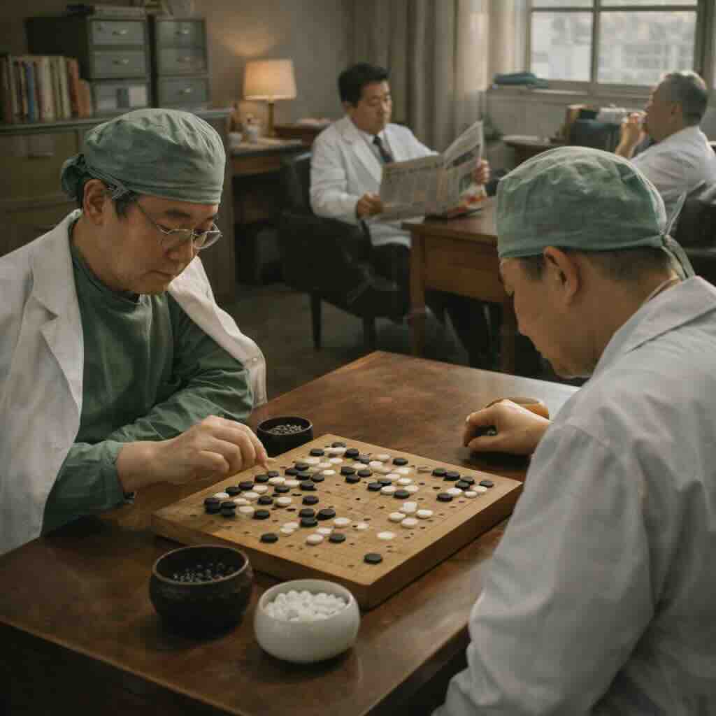 これがAIの提案画像。手術後の昼休みに囲碁をたしなむ外科医二人ですって。
