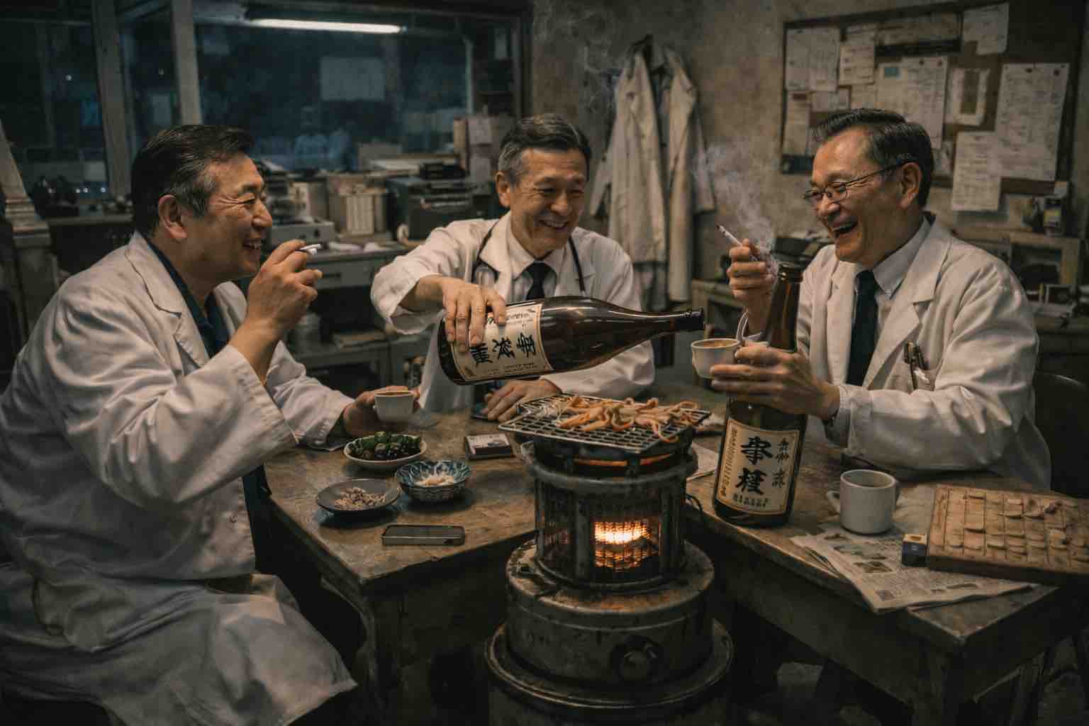 AI提案:夜の酒盛りだそうです。スルメがうまそうです。看護師は夜も働いているのに(ブツブツ)