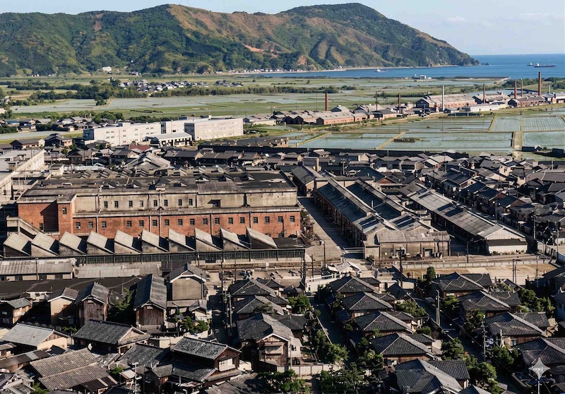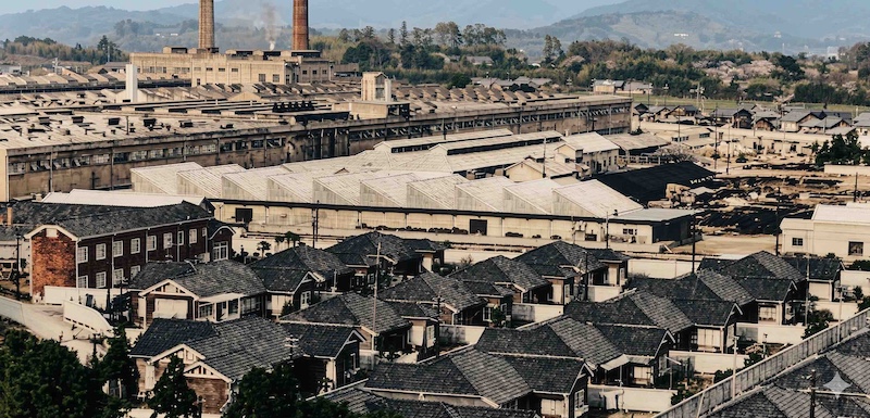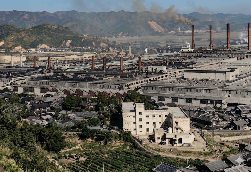 昭和9年頃のレーヨン工場(再掲)。3次拡張工事後のほぼ完成形に近づいたレーヨン工場。鯉のぼりの竹竿が見える。煙突がまだ2本。(オリジナルは「日本窒素肥料事業大観 : 創立三〇周年記念」(1937年))