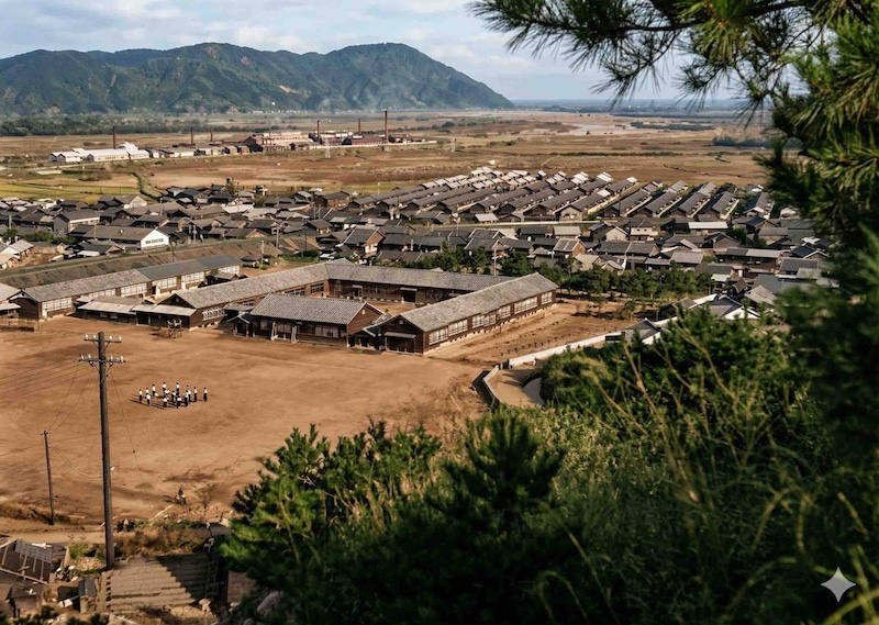 以前パノラマ写真として3枚(この3枚は出所不明です)をつなげて紹介した写真を一枚づつカラー化してみました。これは今の旭小学校の敷地ですが、戦前は延岡商業学校でした。もともと恒富供給所の場所(現在の旭化成事務所)にあった商業学校は延岡市と日本窒素の間の協議で土地交換を行い、中川原に移ってきました。昭和8年のことです。