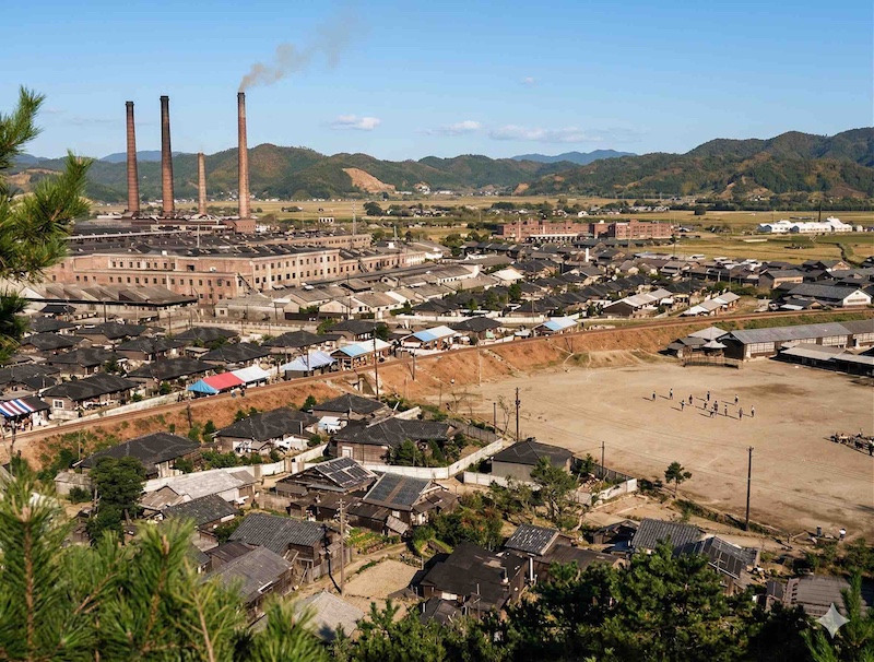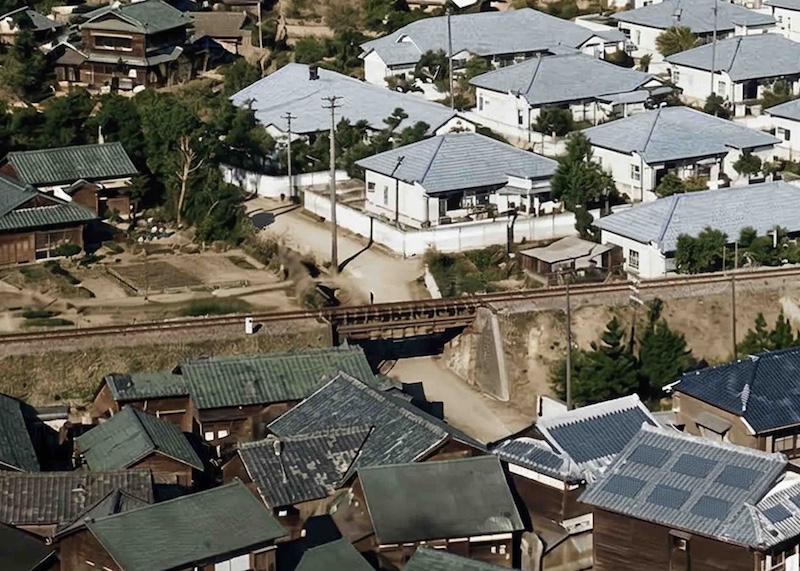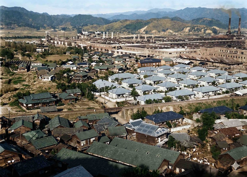 まずレーヨン工場と旭社宅を二枚、疑似カラー化します。一枚は再掲となりますが、自分が住んだことがある方には特に懐かしい写真でしょう。