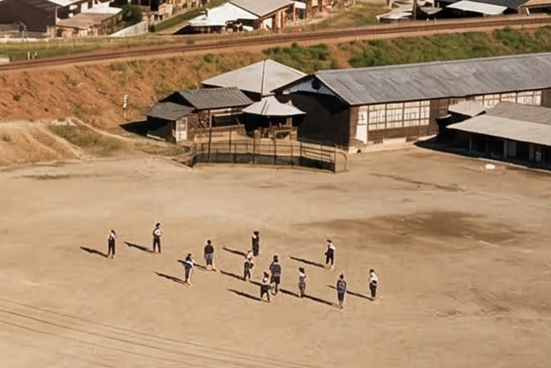 ここには生徒が12名写っています。影に注目すると午後もかなり遅くではないかと思います。放課後に遊んでいるのでしょうか?運動場の端にバックネット様のものが写っていますが、野球はもう日本の学校には入ってきているのでしょうか?