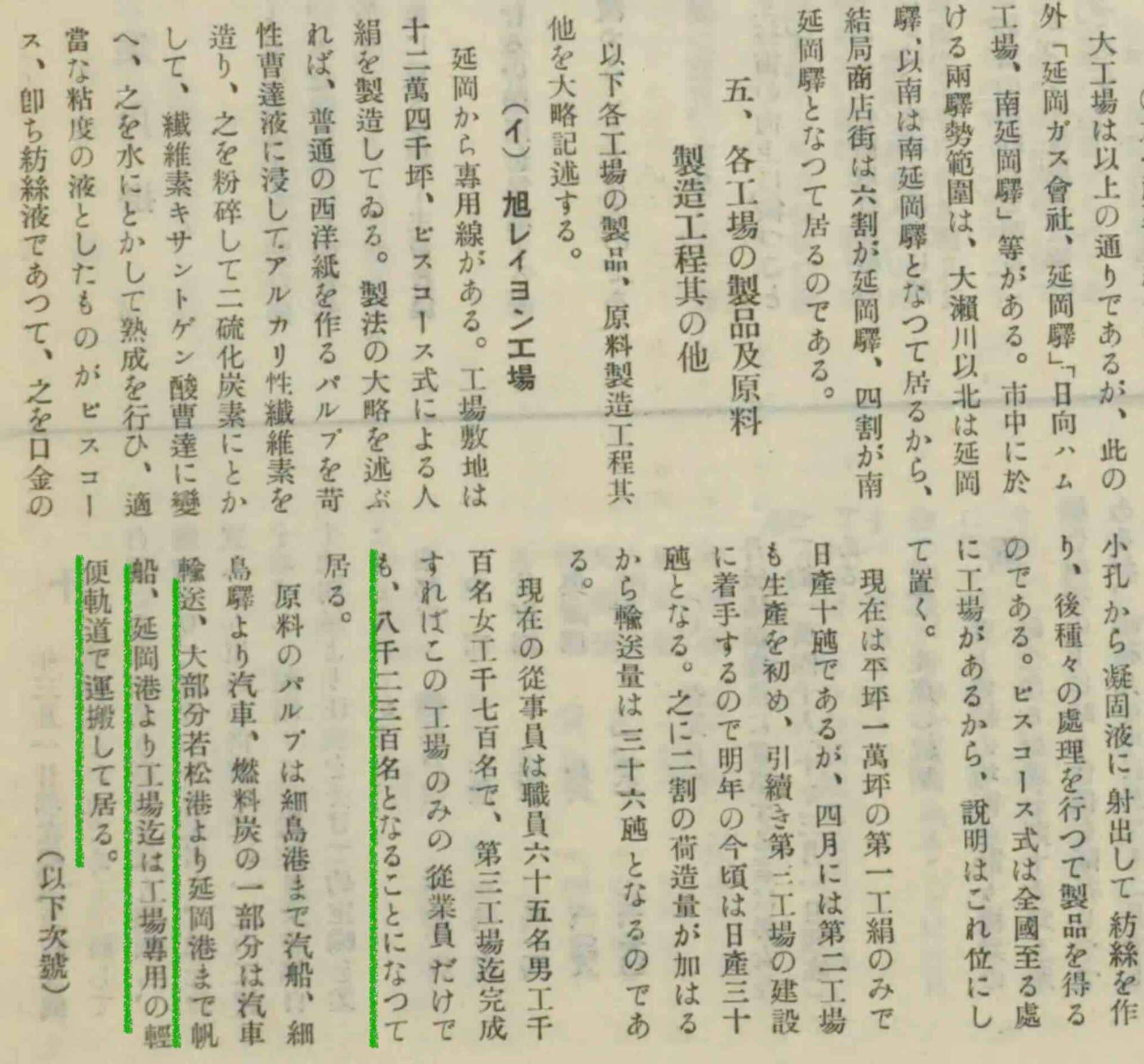 最後の文章がとても興味深いのです。原料パルプは細島まで汽船、そのあと汽車。燃料炭は北九州若松より延岡港まで帆船、延岡港からレーヨン工場までは「工場専用の軽便軌道」で運搬しているとのこと。レーヨン工場と延岡港を結ぶレールが見てみたいです。昭和20年台にレーヨン工場と二硫化工場を結んでいた「まぼろしの引っ込み線」の経路がこれに相当するのではないかと、老人は妄想する。